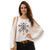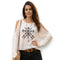 Embroidered Open-Shoulder Poncho Blouse - White – Add western charm with boho flair in this breezy white poncho-style blouse. Crafted from lightweight rayon, it features open-shoulder short sleeves, a round neckline with subtle pom-pom detailing, and bold black tribal and arrow embroidery across the front for standout festival-ready style. A faux keyhole back neckline adds an easy, relaxed finish—perfect for concerts, casual outings, and heritage-inspired looks.