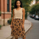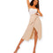 - Features: Twisted Waistband, Front Split Hem, Back Zipper, A-Line Midi, Neutral Tone